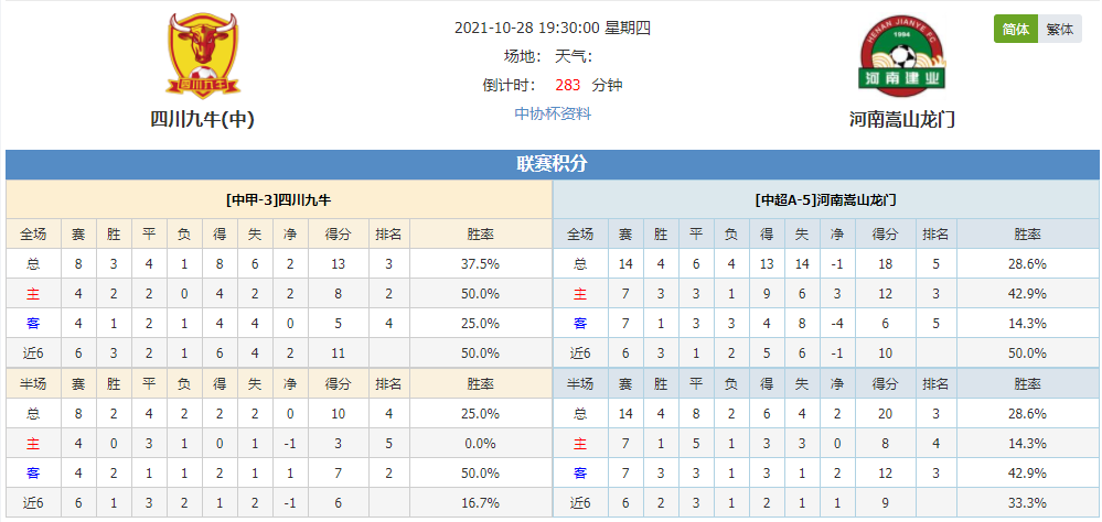 北京时间10月28日19:30,中协杯第六轮赛事四川九牛vs河南嵩山龙门。四川九牛战意顽强,面对强队表现稳定。河南嵩山龙门近期表现出色,进攻端效率有所提升,上一役无奈被对方逼平,此役能否调整状态战胜四川九牛?