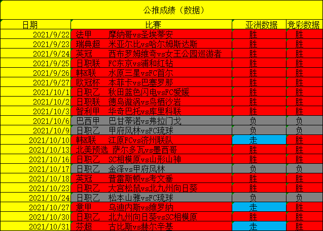 昨日比赛较少未进行公推,公推近17胜13,公推亚洲数据总计335胜203,胜率60.6%,公推总计发挥的相当稳定。昨日精选1场比赛 欧冠杯 塞维利亚vs里尔未能打出,精选近6胜4,说说昨日比赛,塞维利亚连续主场作战且本场比赛必须拿下3分,里尔上一场比赛对战巴黎圣日耳曼,此役客场背靠背作战体能处于劣势,不过最终里尔客场2-1击败塞维利亚稍显遗憾。
