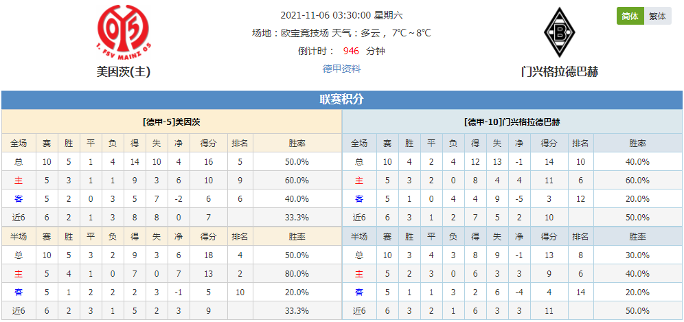 北京时间2021年11月6日03:30,美因茨与门兴格拉德巴赫都在为跻身欧战区而努力,双方整体交锋数据门兴格拉德巴赫占据巨大优势,不过上一役交手门兴格拉德巴赫被美因茨力克取胜,表现有所下滑,本场比赛对于双方缩小排名差距非常重要,此役究竟谁能获胜?