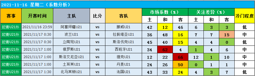 ②关注差异是指通过欧洲数据平均概率与网点成交比例之间的差异,取该场比赛胜平负差异中数值最大的进行比较(当0≤最大差异值<15%时,正常情况;当15%≤最大差异值<21%时,有异常;当最大差异值≥21%时,偏离常规,有冷门出现)。可以理解为数值越高的情况下,出现的冷门概率越高!