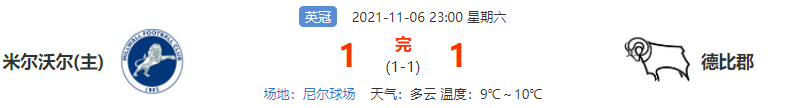 德比郡在11月6日进行了一场英冠比赛,目前休战15天,比赛为客场挑战联赛排名第9的米尔沃尔,双方进球时间十分接近,而且都只是在上半场打进一球,最终结果是德比郡1:1客场战平。