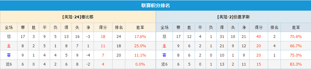 德比郡目前联赛完成了17场比赛,成绩是3胜9平5负,积18分,排名第24;主场完成了8场比赛,成绩是2胜5平1负,主场胜率是25%,主场成绩排名第18。