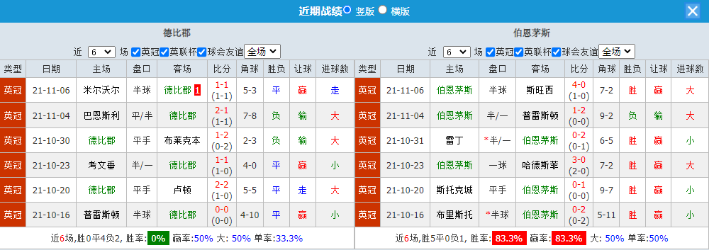 近期成绩对比:此轮对比当然是取胜更多的伯恩茅斯占据优势。