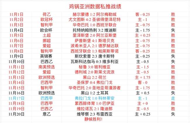 周六私推总进球数1场稳稳胜利,成功反弹!亚洲数据1场维琴察场面优势非常大,同时3次门框,可惜一球落败,运气欠佳,亚洲数据近19胜14,近55胜36!鸡锅私推依然会持续保持精挑细选原则,在精不在多,必须全胜起飞!