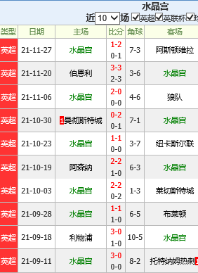 1、水晶宫这球队在英超赛场上实力也并不算强,上季他们排名第14位,本季依旧处在不温不火的局面当中,目前球队只是取得3胜7平3负的成绩,暂居积分榜第11。