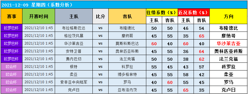 通过对两队的历史成绩、交手成绩及升降级等得出往绩系数;而近况系数则是通过近期(10场左右)成绩分析通过公式计算得出近况系数。
