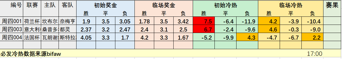 必发冷热数据使用说明:必发冷热数据是根据必发数据、欧洲数据、亚洲数据等通过自行开发的软件综合计算出来的独家数据。该数据能够模拟每场赛事的冷热程度,胜平负某项的正值越高说明越热,就存在大热必死的情况,但该数值无法直接预测比赛结果,不过可以帮助我们判断比赛热门选项,并结合欧洲数据、亚洲数据对赛果进行综合判断。比如,有些场次初始数据较热,说明买入人较多,但如果通过观察欧洲数据变化,发现欧洲数据也同样出现下调的情况,那对本场的热度也是一种降低,风险也是一种回避,也存在打出可能。一般正值稍微高的如1-2左右,我们不做过多关注。如果数值过高,比如5以上,一定要防范冷门赛果。此外该项数据也在动态变化之中,对冷热数据进行初指和临场对比往往更能反映比赛冷热程度,或某一赛果由冷到热,或有热到冷的变化过程。标注红色为大热选项,橙色为偏热选项,蓝色为偏冷选项。如果想详细了解必发冷热数据使用方法及原理,可以查阅本人发布的多篇冷热数据教程。