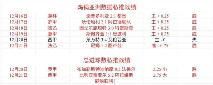周二私推亚洲数据1场+总进球数1场,完美全胜,很舒服!亚洲数据近6胜5!总进球数稳稳2连胜!鸡锅私推会持续保持精挑细选原则,在精不在多,必须全胜起飞!