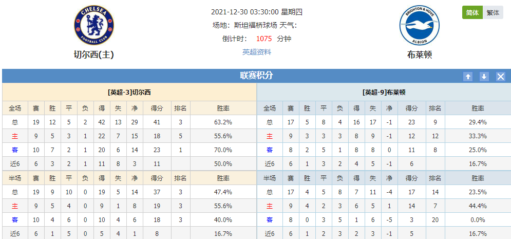 北京时间12月30日03:30,英超第20轮赛事,切尔西对阵布莱顿。切尔西上一役客场战胜后迎来各项赛事二连胜,再度坐镇主场的他们能否乘胜追击?布莱顿状态上仗取胜重回胜轨,相比切尔西他们劣势明显,球队此役能否为保级目标拿走分数?