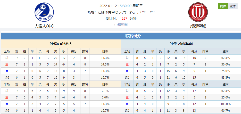 北京时间1月12日15:30,中超附加赛第二回合赛事大连人vs成都蓉城,大连人近期表现稳定,首回合被成都蓉城逼平甚是可惜,他们今仗回到主场能否为收官战拿下胜利?成都蓉城上仗顽强扳平,保留了升级悬念,此番客场走访是否已做好准备?