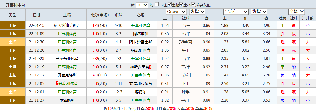 开塞利体育作为土超中下游球队,球队的整体实力不是很高,本赛季联赛赛事取得7胜7平7负的成绩,积28分,球队近期的状态还算比较稳定。上场联赛对战阿达纳迪美斯普,球队在场面上整体的表现尚可,上半场开局被对手阿达纳迪美斯普抢先轰入1球,还好之后再未让对手再实现破门,到比赛末段时刻,球队还轰入了1球,扳平比分,最终1-1与对手握手言和。