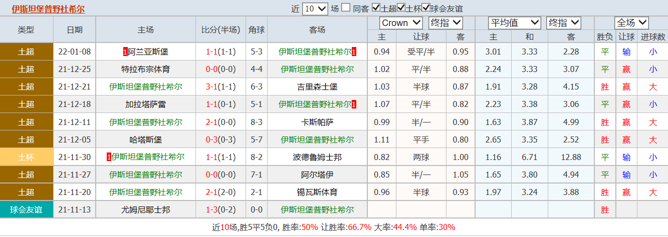 而伯伊斯坦堡普野社希本赛季土超排名第五,球队整体的实力相比开塞利体育要好一些,本赛季联赛赛事取得10胜4平6负的成绩,积34分,球队近期两场联赛未取胜绩。上场联赛面对阿兰亚斯堡,上半场开局对手阿兰亚斯堡强先轰入1球,取得领先,不过还好半场末段扳平了比分,之后很长时间双方都未实现破门,最终以1-1的比分战平。