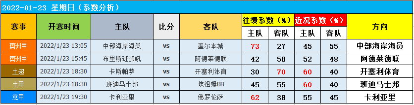 通过对两队的历史成绩、交手成绩及升降级等得出往绩系数;而近况系数则是通过近期(10场左右)成绩分析通过公式计算得出近况系数。