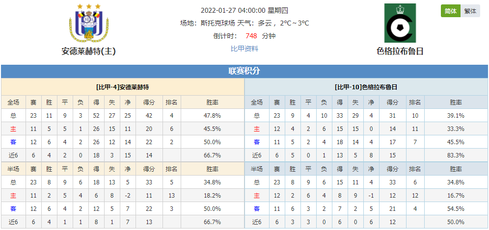 联赛战绩:安德莱赫特23战取得11胜9平3负的成绩,排名联赛第4,进52球,失27球。色格拉布鲁日23战取得9胜4平10负的成绩,排名联赛第10,进33球,失29球。