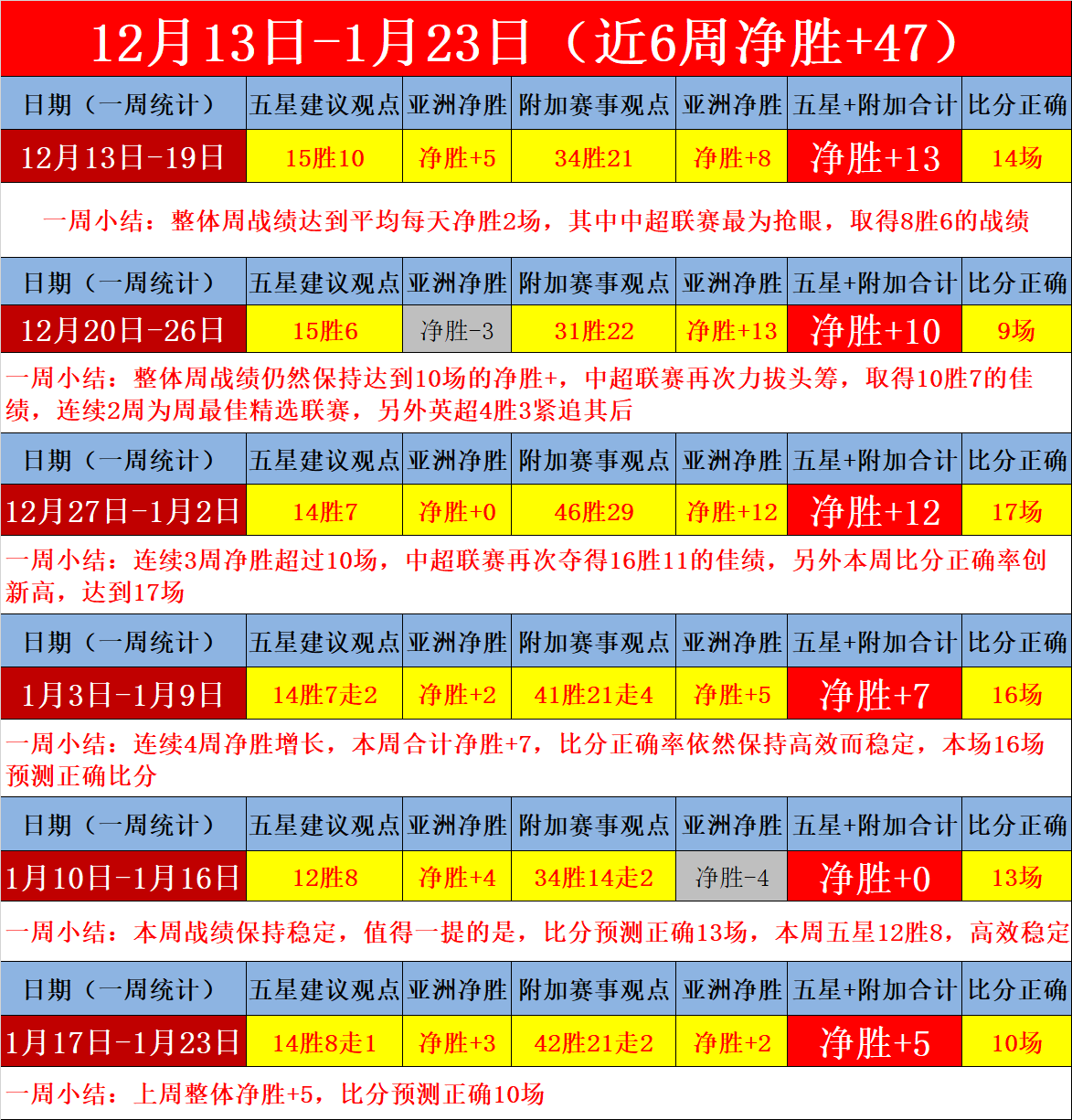 至今已经连续6周正向净胜的成绩,目前过去六周战绩(12月13日-1月23日)合计净胜+47,平均1天净胜+1.1场,本周继续稳步前行,再创巅峰战绩,温馨提示:一定要关注每一场比赛,推演士已经连续6周净胜增长,这并不是偶然,这是推演实力的见证,稳定的胜率基本已经上轨道。