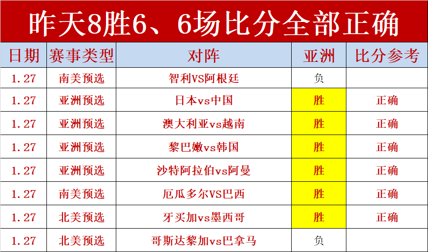 1、昨天预选赛拿下8胜6的超高胜率,其中亚洲预选大获全胜,4场全胜,胜率高达100%,并且4场都预测正确比分。