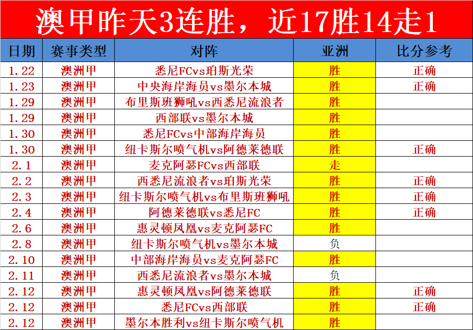 3、另外澳甲也是强项之一,近17场胜14走1,只有2场失手