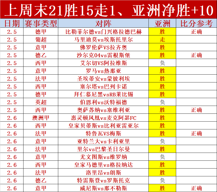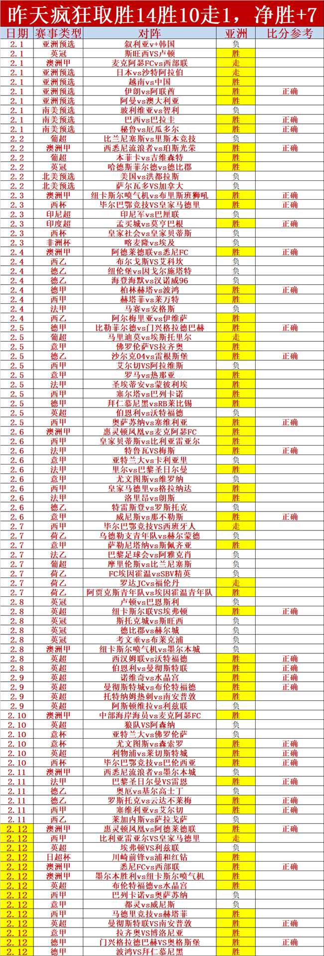 1、昨天战绩彪悍,推14胜10走1,14场支持3场失手,4场比分都预测正确,昨天早场拿下4连胜,澳洲3连胜,另外晚场战绩不俗,德甲2连胜,英超意甲西甲分别只有1场失手,其中德甲的门兴预测正确3比2大比分,值得称赞的是昨天成功抓住2场热门赛事的冷门,其中包括曼联遭对手逼平,拜仁客场不敌升班马波鸿,目前二月份97胜56走6,亚洲净胜+21,二月份势头正劲,今天周末继续冲刺高胜率。