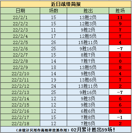 大数据栏目:本栏目将当天的赛事列出经由大数据分析得出的任何高概率选项供网友参考(期间若连续2天总胜率低于50%,将免费1期补偿)。现时大数据分析逐渐融入我们的生活当中,任何一个动作都能参照历史数据得出下一个行为是什么。足球作为一项竞技体育赛事,自然也离不开大数据的分析,在可供查找的数据中我们可以经过特殊的算法得出赛事的某些选项高频概率,而本栏目正是因此而创建。