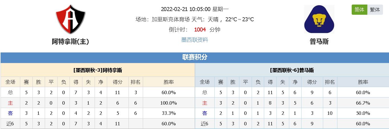 北京时间2月21日10:05,墨西联秋第6轮赛事,阿特拿斯vs普马斯。普马斯近年来多次在阿特拿斯主场均全身而退,此次出击能否再折对手?阿特拿斯多次让主场观众大失所望之后,能否有所转变?