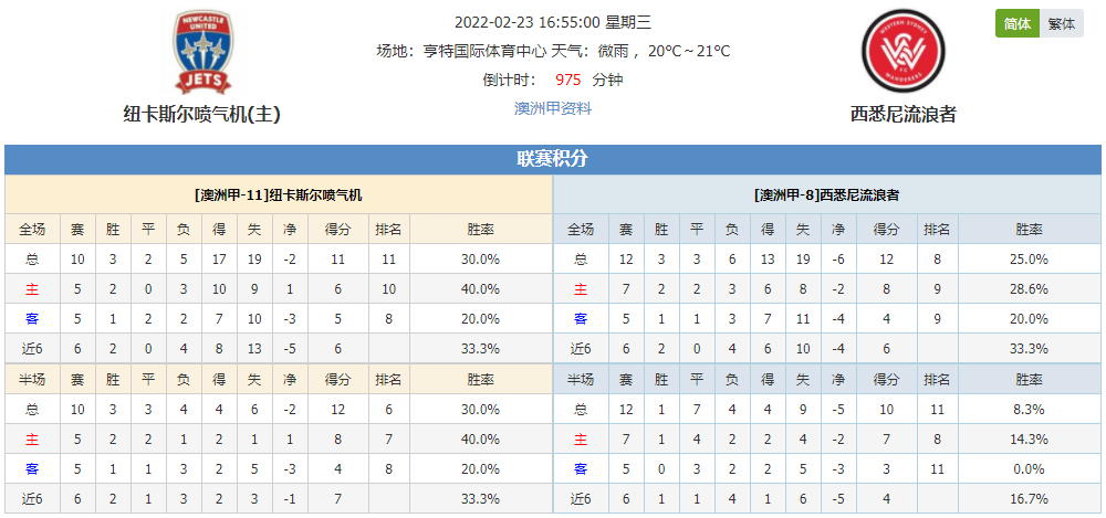 北京时间2月23日16:55,澳洲甲第13轮比赛正式拉开,纽卡斯尔喷气机将坐镇主场迎战西悉尼流浪者,纽卡斯尔喷气机目前联赛排名第11位,西悉尼流浪者目前联赛排名第8位,两队积分仅有一分之差,实力可谓不相上下,本场比赛他们将如何展开?我们拭目以待。