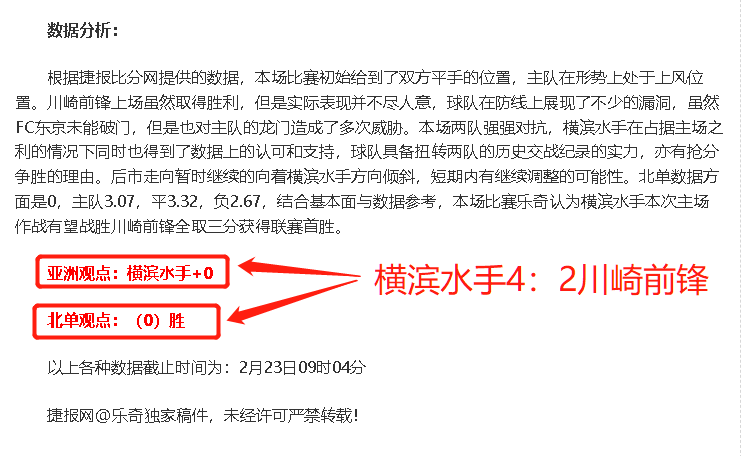 乐奇本日早场比赛与大家分享了日职联横滨水手vs川崎前锋的比赛,本场比赛双方对战十分激烈,虽然川崎前锋以1球优势进入下半场,不过上半场韬光养晦的横滨水手在下半场哨声响起之后就对客队发起了多轮的攻势,双方进入了互攻抢分的局面,最终横滨水手技胜一筹以4:2拿下川崎前锋,球队获得了本赛季的首场胜利,同时乐奇的成绩再下一城,近期亚洲总体成绩为13胜9,胜率持续上升,接下来为大家带来一场日职联的赛事横滨水手vs川崎前锋,希望能通过本场比赛的分析,能得到各位的认可,和大家分享更多更好的见解,有望各位多多支持!