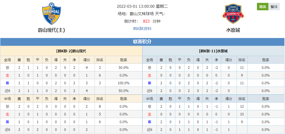 联赛战绩:蔚山现代2战取得1胜1平0负的成绩,排名联赛第2,进2球,失0球。水原城2战取得0胜0平2负的成绩,排名联赛第11,进0球,失2球。