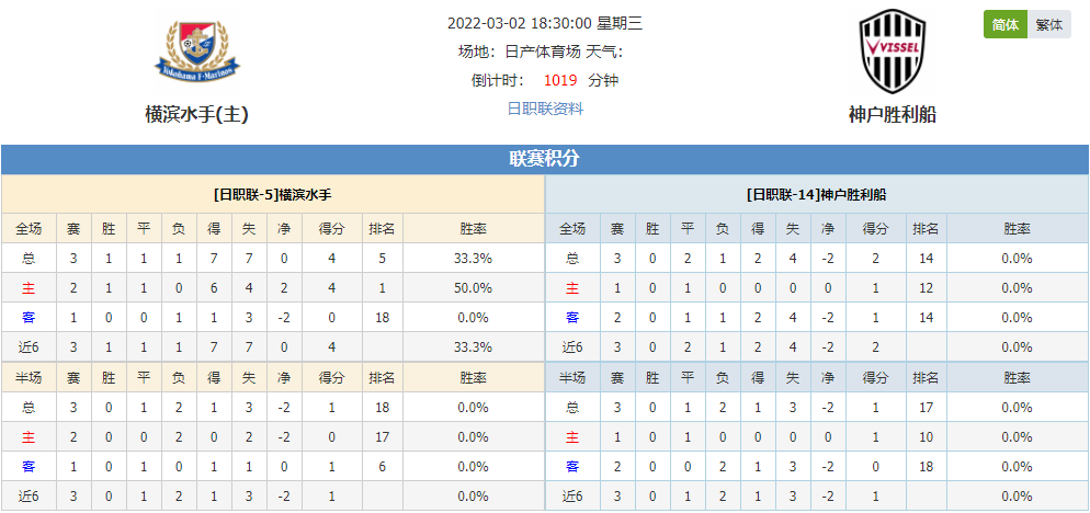 联赛战绩:横滨水手3战取得1胜1平1负的成绩,排名联赛第5,进7球,失7球。神户胜利船3战取得0胜2平1负的成绩,排名联赛第14,进2球,失4球。