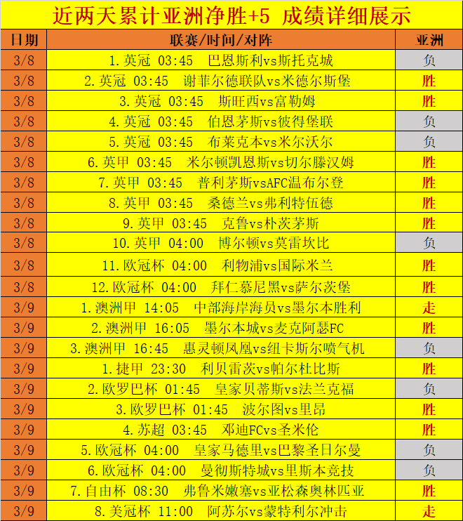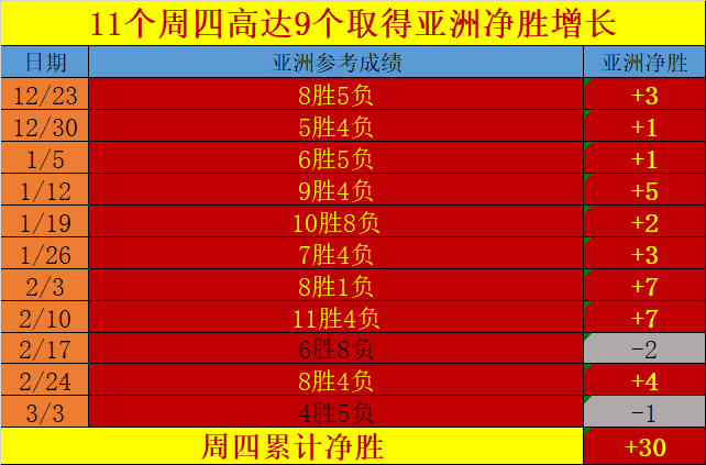 (三)成绩回顾:昨天成绩继续以亚洲净胜增长呈现,近两天累计拿下亚洲净胜+5。今天周四,周四的赛程更合适CDA数据模型发挥,周四过往表现保持优质,近11个周四高达9个周四为亚洲净胜增长成绩,近11个周四累计取得亚洲净胜+30场,周四的成绩明显比往常更为优质,更值得进行分析参考。一场比赛信息面波谲云诡,外界利用信息面的不对称,达到他们所希望的目的,我们唯一能做的不是寻找更多信息面,而是通过数据面的复杂计算,了解他们的目的,做到知己知彼、百战不殆。