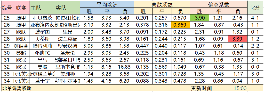 偏离系数使用说明:偏离系数由偏态系数和离散系数组合而成,简称偏离系数,离散系数是测度数据离散程度的相对统计量,主要是用于比较不同样本数据的离散程度。离散系数大,说明数据的离散程度也大;离散系数小,说明数据的离散程度也小。通常我们认为离散系数大说明各家单位对该项赛果的分歧大,不容打出,一般来说离散系数最小的两项打出概率较高。但离散系数只是描述分歧的相对大和小,比如胜平负三项离散系数都很高,说明三项分歧都较大,我们不能盲目排除分歧最高的一项。另外,离散系数也只是描述了分歧大和小,有时候分歧大,可能看好的单位更多,所以我们又引入了偏态系数,偏态系数为正,代表各家单位整体更看好该项赛果,数值越高,代表看好程度越高,我们把-2.4——2.4定义为小偏态,低于-2.4和高于2.4定义为大偏态,一般来说正值大偏态代表单位更加看好该选项。这两个系数需要综合参考,比如让球方离散系数低,同时偏态系数高,则打出概率大;如果让球方离散系数高,同时让球方偏态系数低,受让方偏态系数高,则出冷概率增加。最后提醒大家,由于偏离系数根据欧洲数据计算而来,所以当欧洲数据变动较大会造成偏离系数变动较大,也请大家留意临场欧洲数据变动情况。此外,当离散系数高于1,偏态系数绝对值大于15,往往属于数据异常,不易盲目参考。后期我们会随着数据的积累陆续发布使用教程。