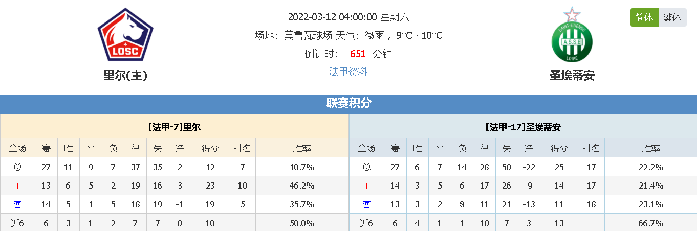 北京时间3月12日04:00,法甲2021-2022联赛第28轮比赛,本赛季法甲的卫冕冠军里尔基本已经冲冠无望,但是目前跌出欧战区的成绩始终未能合格,而本场对阵同样退步且面临保级边缘的圣埃蒂安,是否有机会在对方手下取得分数?