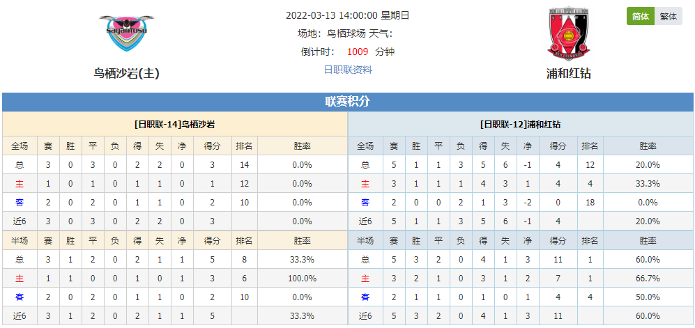 北京时间2022年3月13日14:00,日职联迎来第6轮赛事,鸟栖沙岩主场对战浦和红钻,鸟栖沙岩新赛季仍未有胜绩,状态欠佳,本轮能否拿下首胜?浦和红钻上轮联赛取得了新赛季的首场胜利,士气正盛,本轮主场能否延续胜绩?