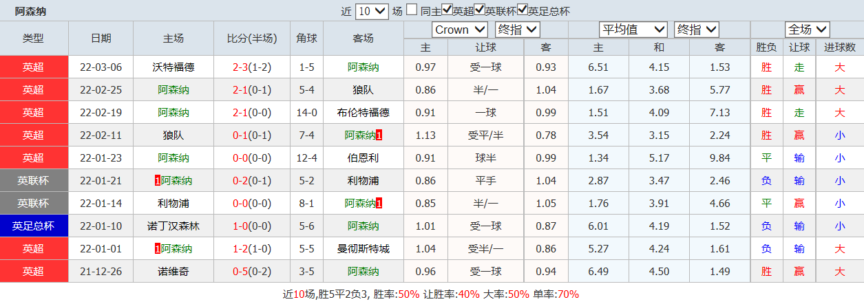 阿森纳作为英超强队,球队整体的阵容和实力强,本赛季联赛整体赛事取15胜3平7负的成绩,目前排名第五名。球队近期整体的状态还不错,上场联赛客场面对沃特福德,球队在场面上整体处于上风,比赛开局5分钟球队便率先轰入1球,取得领先,之后对手沃特福德虽有进球,但上半场球队还是以2-1领先,下半场球队再次轰入1开局球,可惜比赛末段丢了1球,最终以3-2的比分战胜对手。