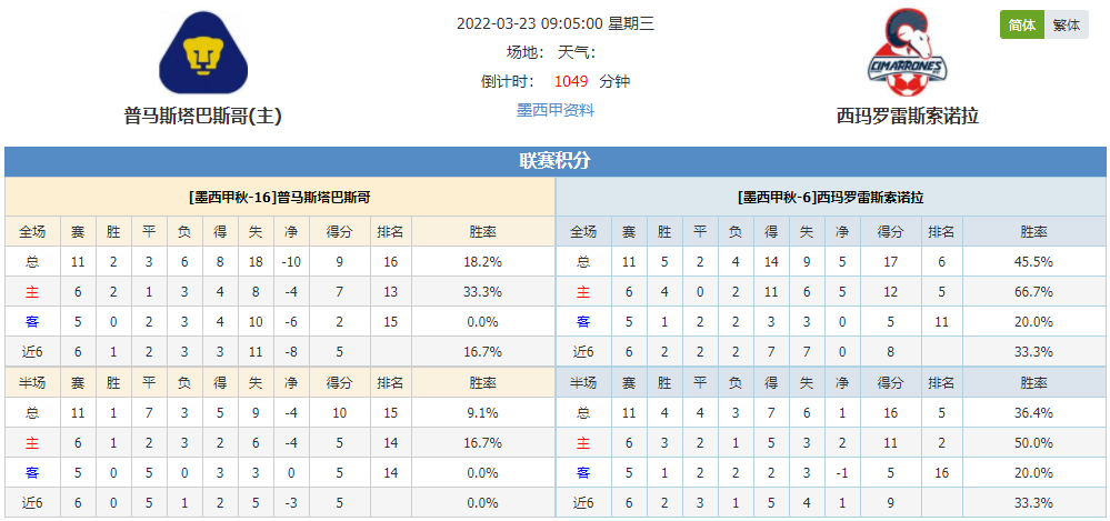 北京时间2022年3月23日09:05,墨西甲秋季联赛继续火热进行,本场比赛由普马斯塔巴斯哥坐镇主场迎战西玛罗雷斯索诺拉,两队最近一次交手,普马斯塔巴斯哥客场遭遇失利,此番回到主场,普马斯塔巴斯哥能否全身而退?