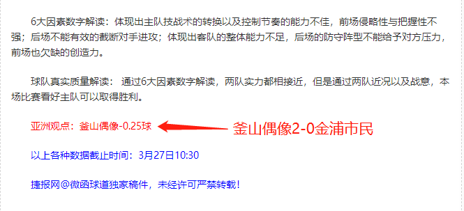 精彩历程回顾:刚刚完场的韩K2联:釜山偶像vs金浦市民,参考了主队方向的观点,同样顺利拿下!昨天早场为大家送上的4场澳洲甲比赛,取得4胜3的优异成绩;整体表现8胜5。长期稳定的增长,是微函球道的奠基石;微函球道将函数6大主因素对赛事方向的独特见解与大家分享,期待大家对赛事分析有质的飞跃帮助。
