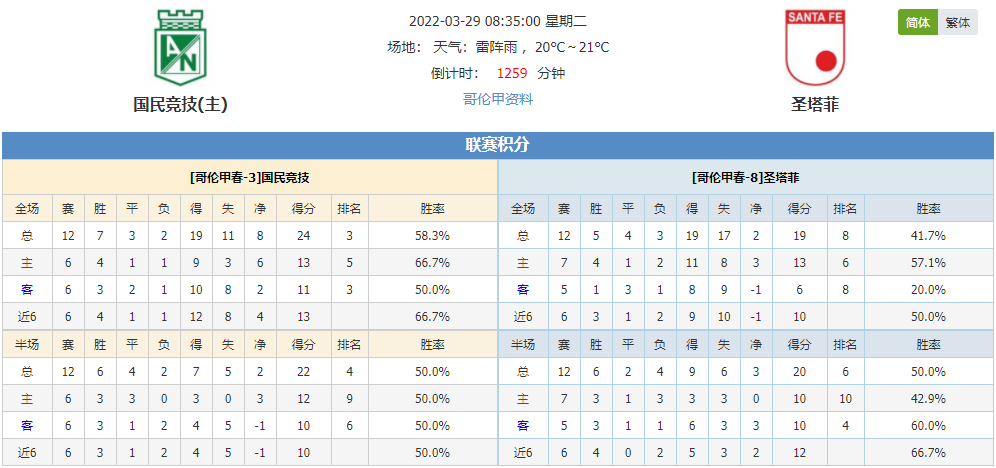 北京时间2022年3月29日08:35,哥伦甲春季联赛继续火热进行,此战由国民竞技坐镇主场迎战圣塔菲,国民竞技上轮联赛客场战平卡利体育会,本轮主场能否重回胜轨?圣塔菲上轮联赛主场斩获胜仗,本轮客场能否延续胜绩?