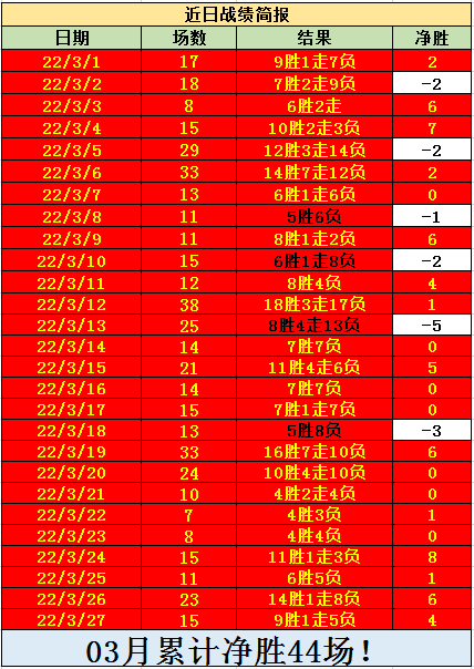 昨天数据表现出色,早场的4场有2场顺利打出,晚场的6场有3场顺利打出,夜场的5场全部打出,拿下大满贯的出色表现!昨天数据中,早场的韩K2联表现出色,2场都顺利拿下,而澳洲甲则是在主队90分钟送出点球的情况下被灭掉,颇为可惜!晚场的表现一般,其中荷乙和以甲的表现出色,2场都顺利拿下,非常的不错!夜场的表现惊人,其中智甲和巴圣锦标2场都是大获全胜拿下的,非常的不错!当然哥伦甲继续有惊人表现,3场全部打出,再次为净胜立下大功!