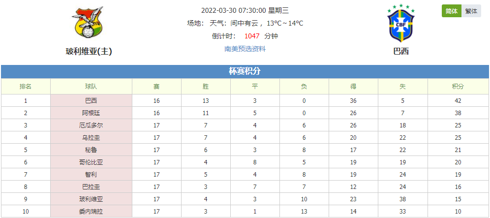 杯赛战绩:玻利维亚17战取得4胜3平10负的成绩,排名小组第9,进23球,失38球。巴西16战取得13胜3平0负的成绩,排名小组第1,进36球,失5球。