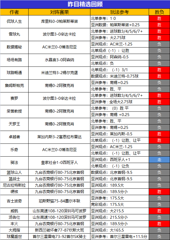 付费精选专区:作者侃球人生、雪球丸、球路畅通、赛罗、卓越者、硬核、丰火昨日送出的精选赛事参考大获全胜,其中卓越者近3场胜率100%,硬核近4场胜3场,丰火近3胜2今天精彩赛事依旧有,捷报作者团最新独家分析及心水参考已经在首页更新,欢迎各位有兴趣的朋友前来查看!