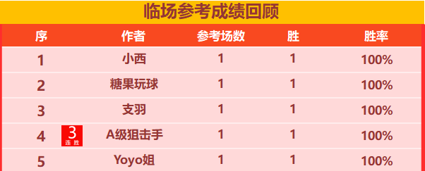 关注捷报前瞻栏目,作者胜场天天有,赶紧来看看今天有哪些作者榜上提名: