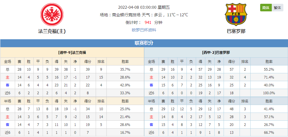 法兰克福本赛季德甲成绩10胜9平9负,积分39,排名第9;巴塞罗那本赛季西甲成绩16胜9平4负,积分57,排名第2