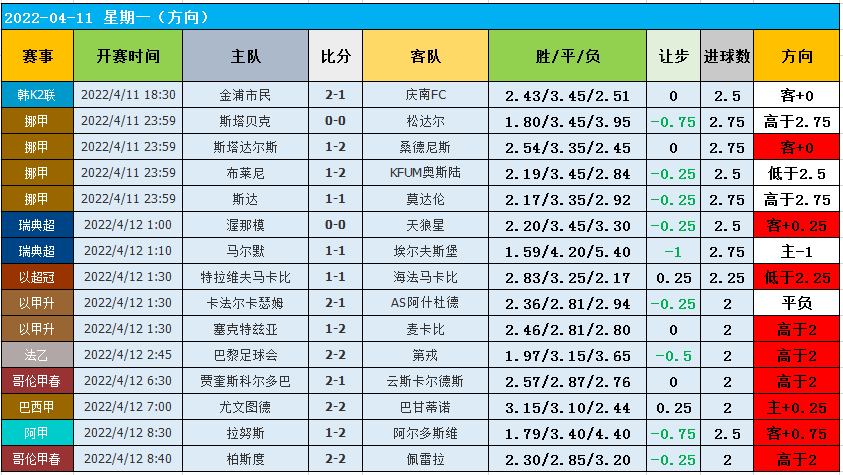 今天的比赛较多,笔者挑选了部分早晚场比赛出来作为本期的参考,希望能够打出对应的高概率方向!
