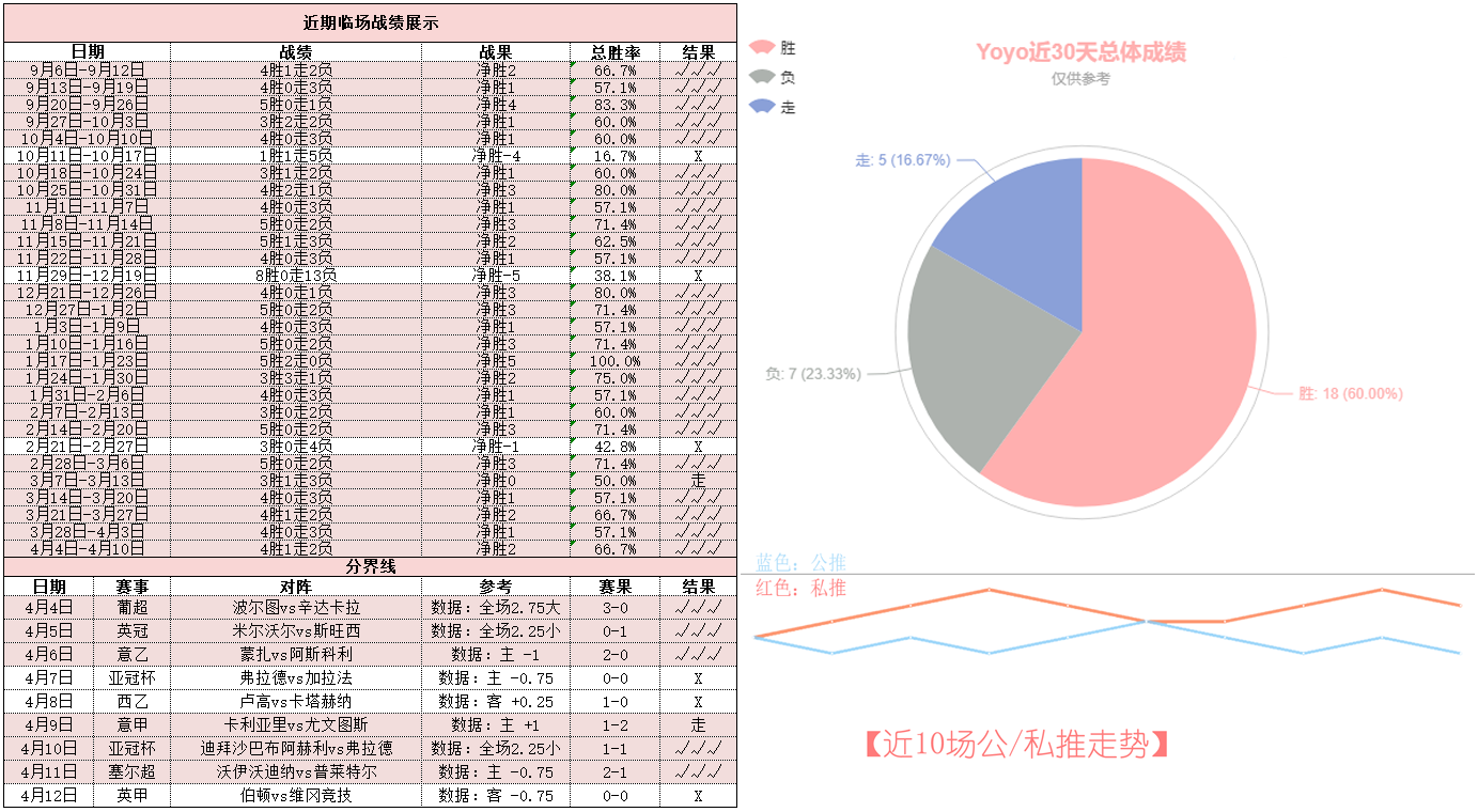 Hello,各位粉粉!我是Yoyo呀,小女子在捷报大家庭已经进驻良久,粉丝数在近段时间已经接近1.3w,感谢各位粉粉的支持呀!对于本人,近期整体战绩正值最佳的状态,其中最近核心临场近26胜17走1取得不俗战绩,而公推方向同样表现棒棒哒!看球赛是每日必修,对球赛有自己独到的见解和分析,擅长拆解赛事数据,稳中求胜,欢迎友友们持续关注哦~