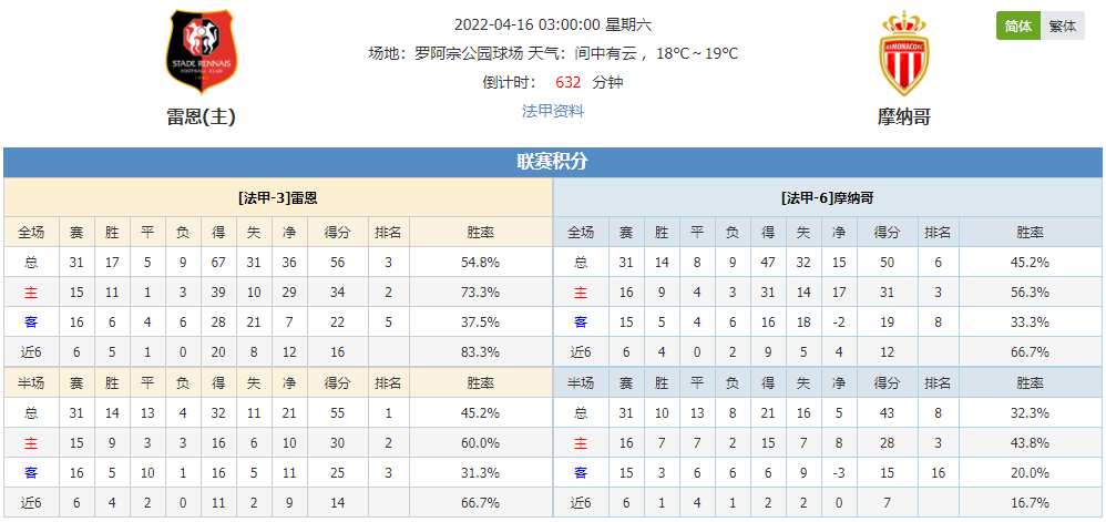 联赛战绩:雷恩31战取得17胜5平9负的成绩,排名联赛第3,进67球,失31球。摩纳哥31战取得14胜8平9负的成绩,排名联赛第6,进47球,失32球。