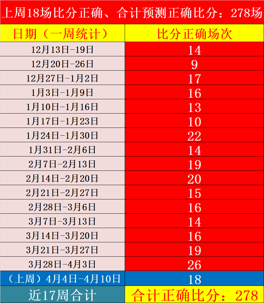 3、预测正确比分统计,过去17周(12月13日-4月10日)推演士共预测正确比分达到了278场,这数字惊人,说明一个道理,就是推演模拟方向精准度非常高,而且是长期稳定的,同样也统计了过去17周的战绩,发现了几乎每天都有预测正确比分,请大家持续关注推演士。