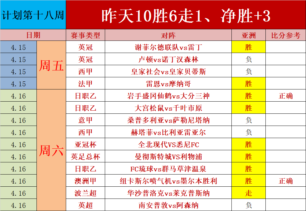 1、推演士计划第十八周,周末成绩不负众望,昨天一举拿下10胜6走1的战绩,亚洲净胜+3,其中早场取得4连胜,日职乙3连胜,另外昨天的五星建议3连胜,经过调整后迅速开启连胜,建议大家要持续关注,今天周日继续冲刺。