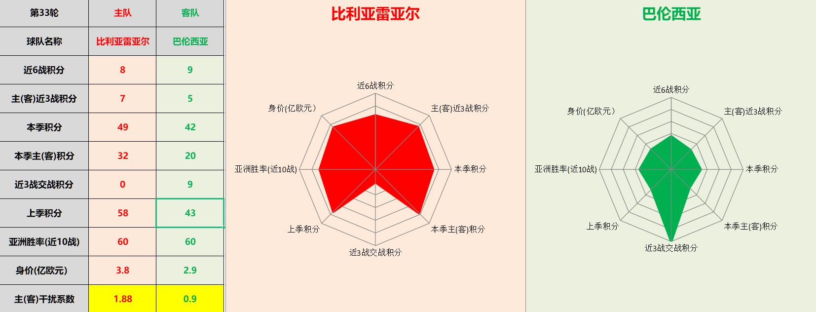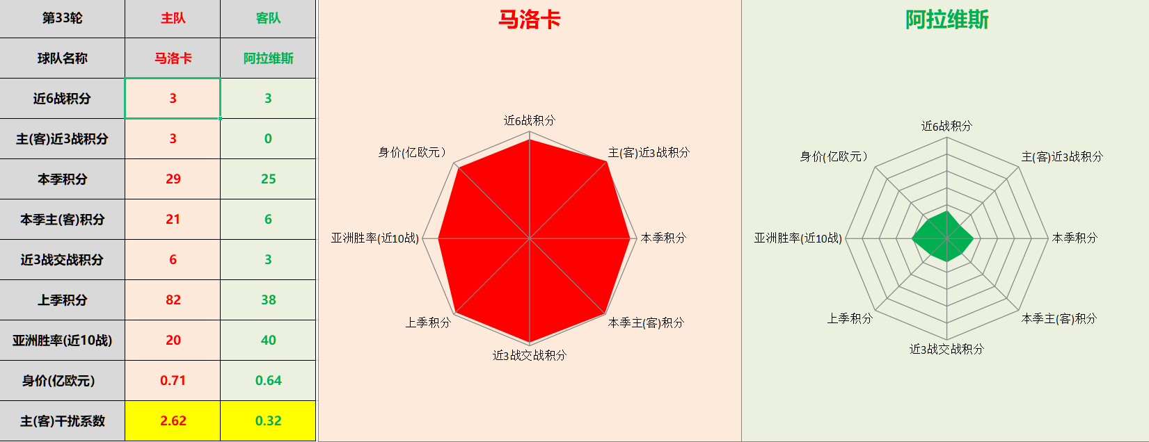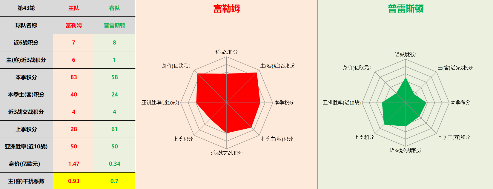 注:网状图干扰系数解析,主客队会受到主客场客观因素干预,抹去比赛场地干扰进行对比更能清注:网状图干扰系数解析,主客队会受到主客场客观因素干预,抹去比赛场地干扰进行对比更能清晰反馈球队真实实力,网状图面积片区均为干扰系数×各项积分所得。主队干扰系数为客场积分除以主场积分所得,客队干扰系数为客队主场积分除以客场积分所得。