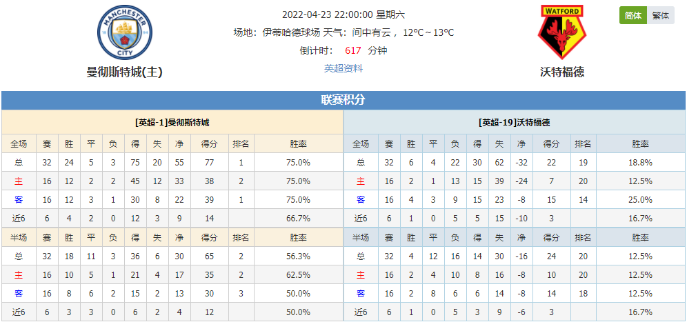 北京时间2022年4月23日22:00,英超第33轮较量,由曼彻斯特城坐镇主场迎战升班马沃特福德,曼城过去10次面对沃特福德保持全胜,优势极其明显,此番主场面对近期处于连败势头的手下败将,曼城能否大胜而归?