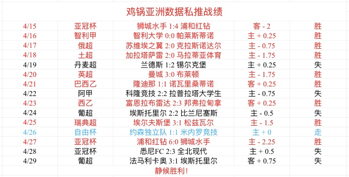 周五私推结果不佳,亚洲数据1场16分钟就遭遇洪卡,无力回天,亚洲数据近14胜9!总进球数1场差一个球,没能打出,还需继续努力研究!鸡锅私推会持续保持精挑细选原则,在精不在多,必须全胜起飞!