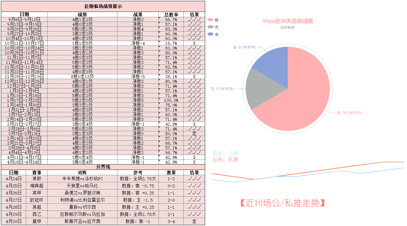 昨晚周六私推意甲拉齐奥4-3与胜利擦肩而过,核心临场依然保持低调六连胜(嘘~)!而公推英超曼城4-0大胜利兹联,竞彩、亚洲方向再次稳稳跑出,公推近10胜8表现棒棒哒!——今天重点参考场次已经确认,信心依旧,强势Yoyo期待打响5月开门红!